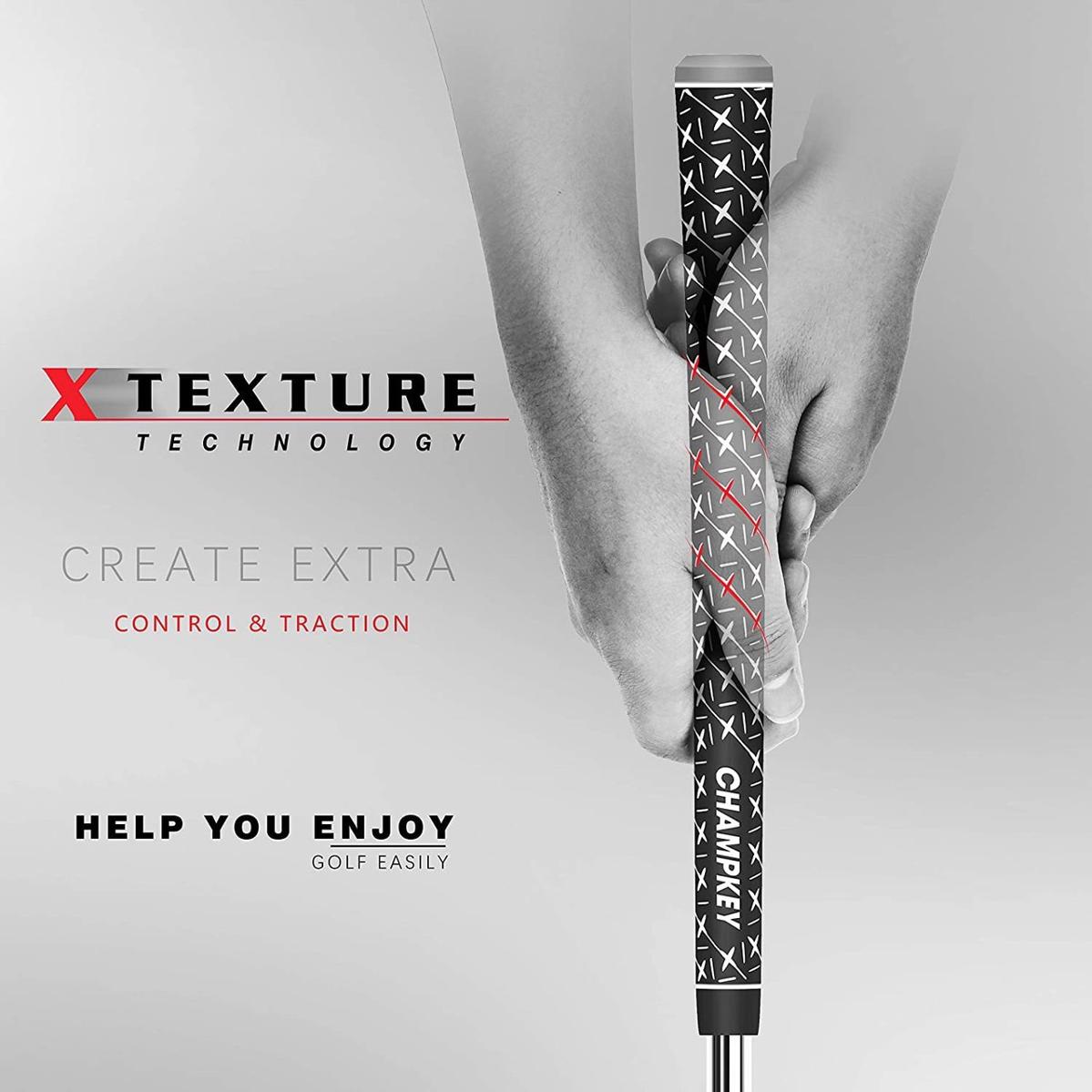 CHAMPKEY X-TEXTURE TECHNOLOGY CREATE EXTRA CREATE EXTRA CONTROL & TRACTION HELP YOU ENJOY GOLF EASILY ALL WEATHER CONTROL The "LINE" shaped texture around the grips can channel away moisture from the hands and keep dry all conditions MORE POWER A LARGER L